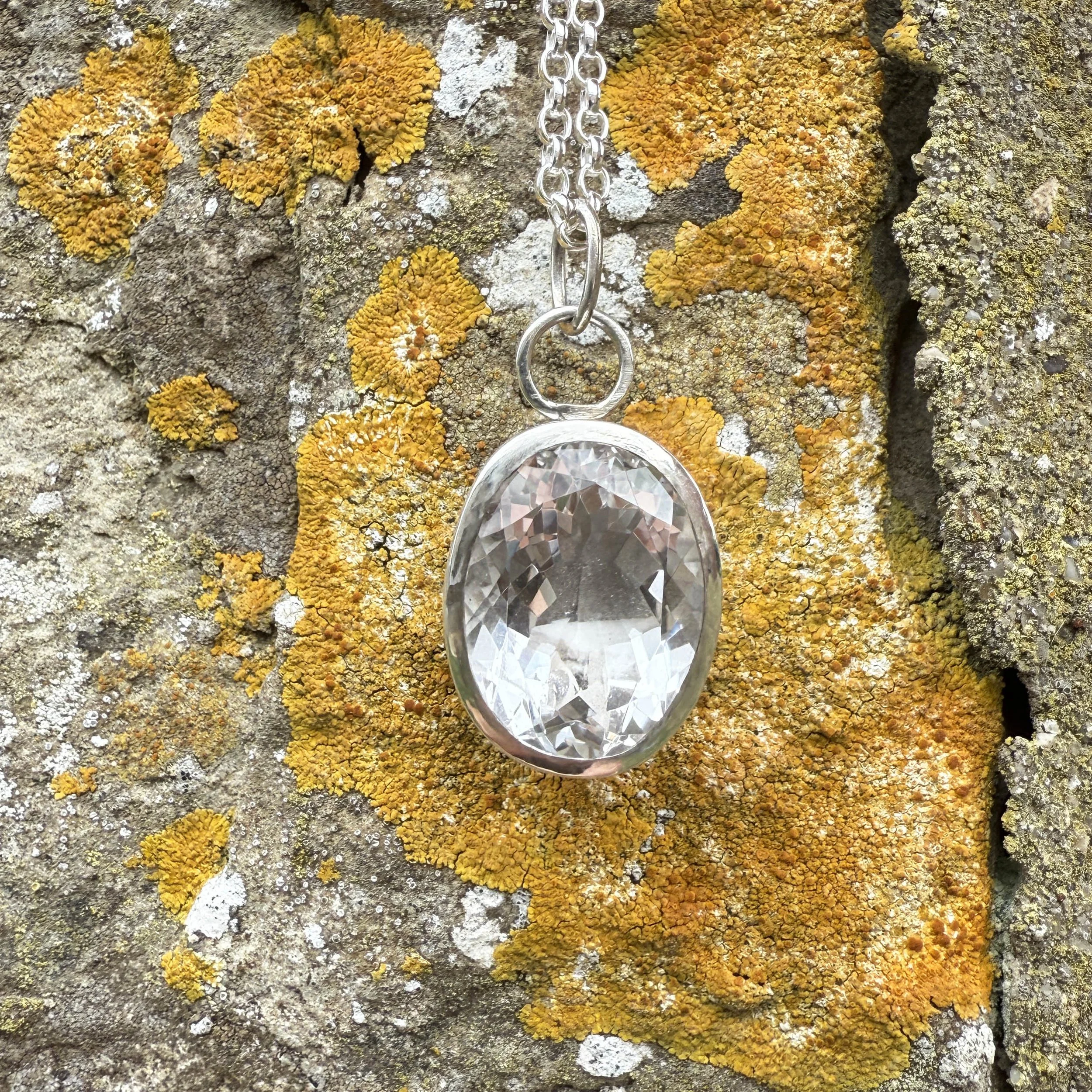 Ashes were used in this pendant along with 15 tiny diamonds, one for each year of her precious life. The stone is a clear, facetted quartz crystal so the ashes and diamonds can be seen, almost like a kaleidoscope.